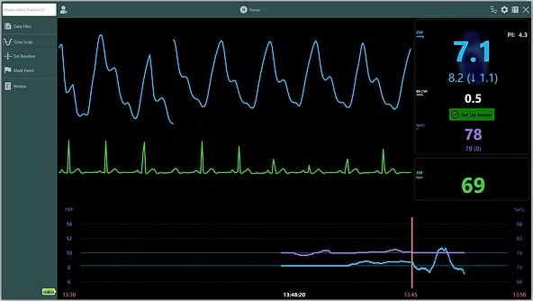 Specific features: Completely non-invasive, eliminating the risk of catheter infection. Real-time monitoring with curve and trend visualisation. Multi-platform compatible (tablets, computers, third-party monitors). Home use with remote monitoring. Reusable sensors drastically reducing costs.
