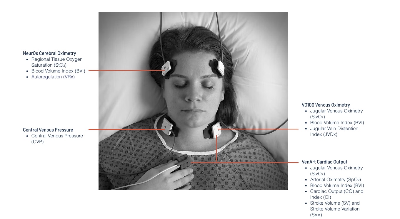 Technical specifications: Combines four sensor systems: NeurOs Cerebral Oximetry (regional cerebral saturation), VENUS 2000 CVP (central venous pressure), VO 100 (jugular oximetry), VenArt (cardiac output). Near-infrared spectroscopy (NIRS) technology with reusable sensors. Accuracy: ±1.5% cerebral saturation, ±2.16 mmHg CVP, ±2% venous oximetry.