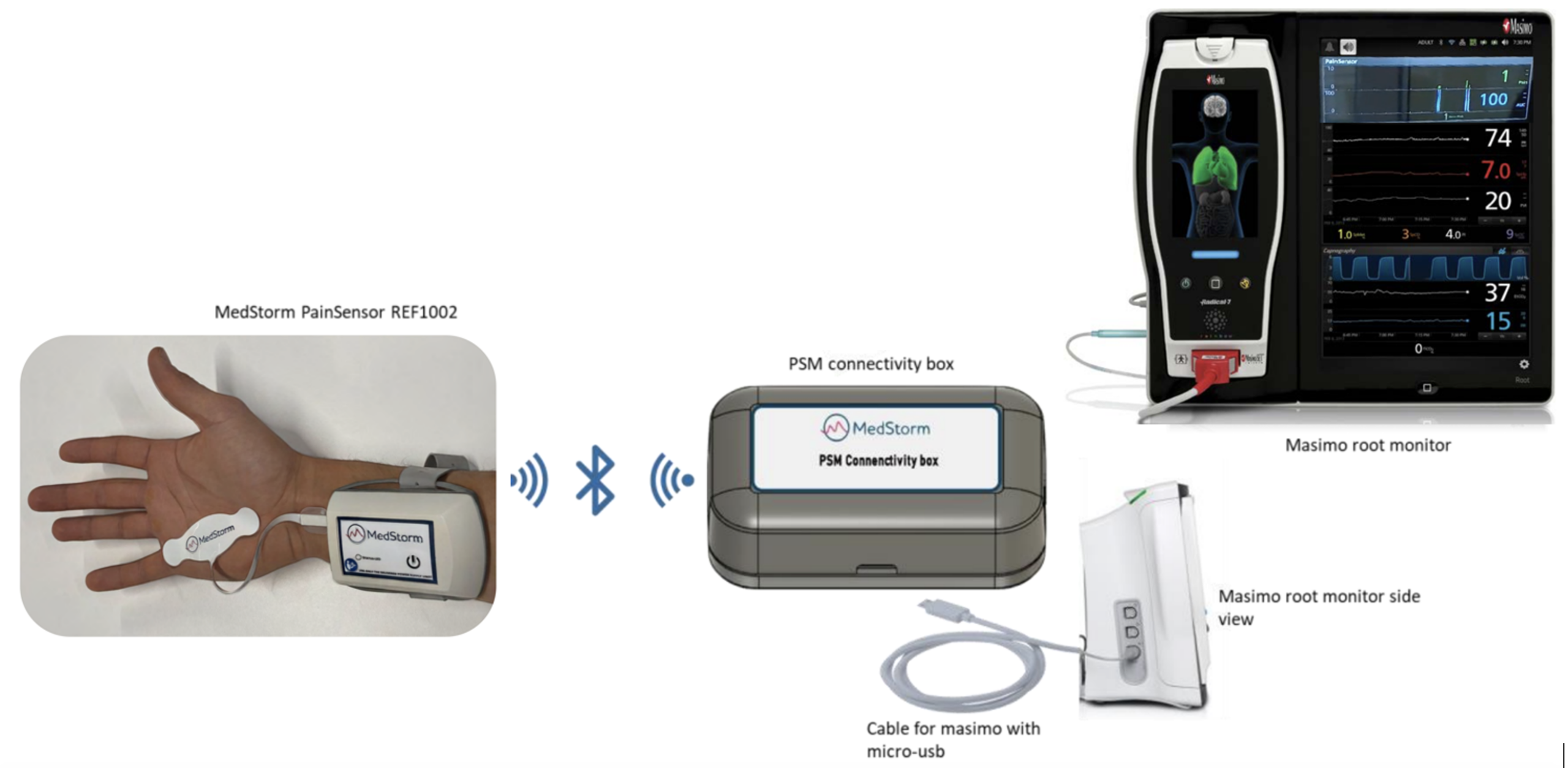 The MedStorm Pain Sensor is a wearable device that measures real-time pain and nociceptive stimuli via changes in skin conductance, reflecting skin sympathetic nerve activity (acetylcholine on muscarinic receptors).
